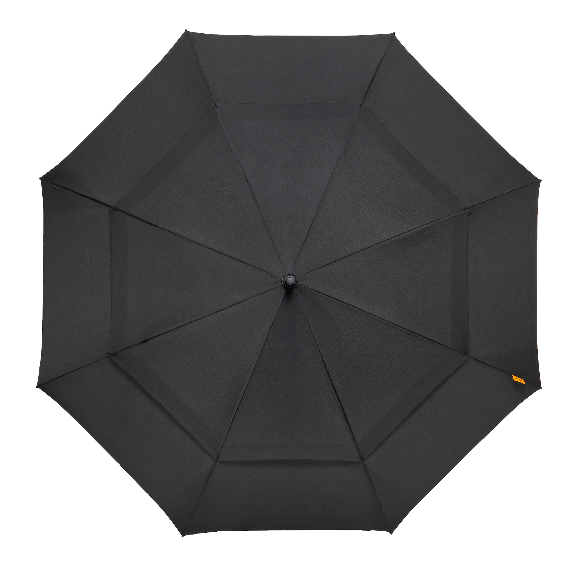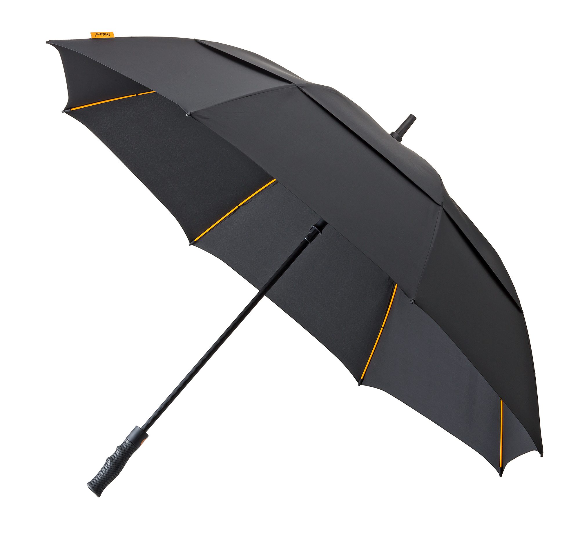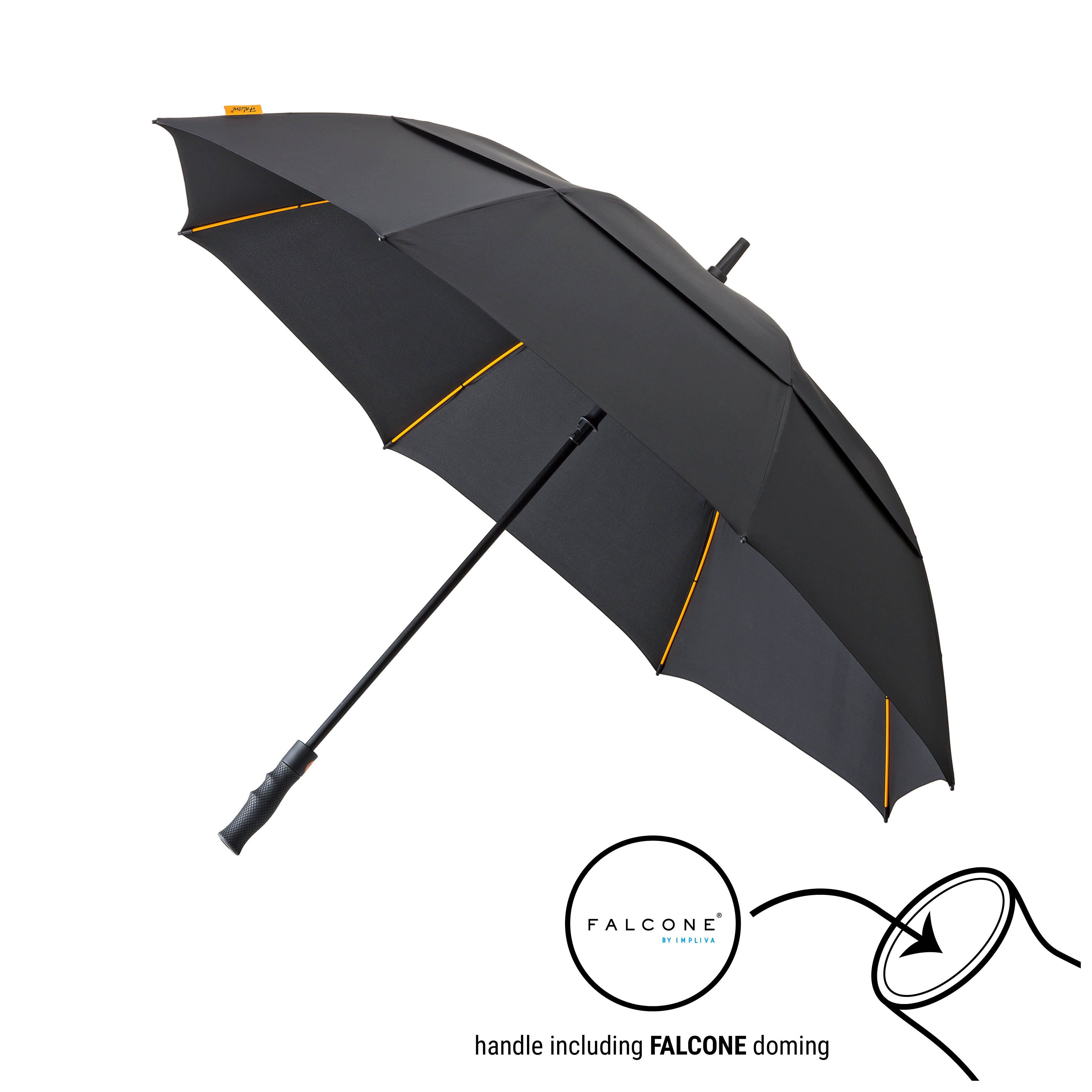 GP-76 Falcone® high quality windproof golf umbrella, automatic. Orange fiberglass frame with black fiberglass shaft. 210T polyester pongee cover, with ventilation system. Black rubber finished handle, including Falcone doming. The umbrella comes with a self material case.