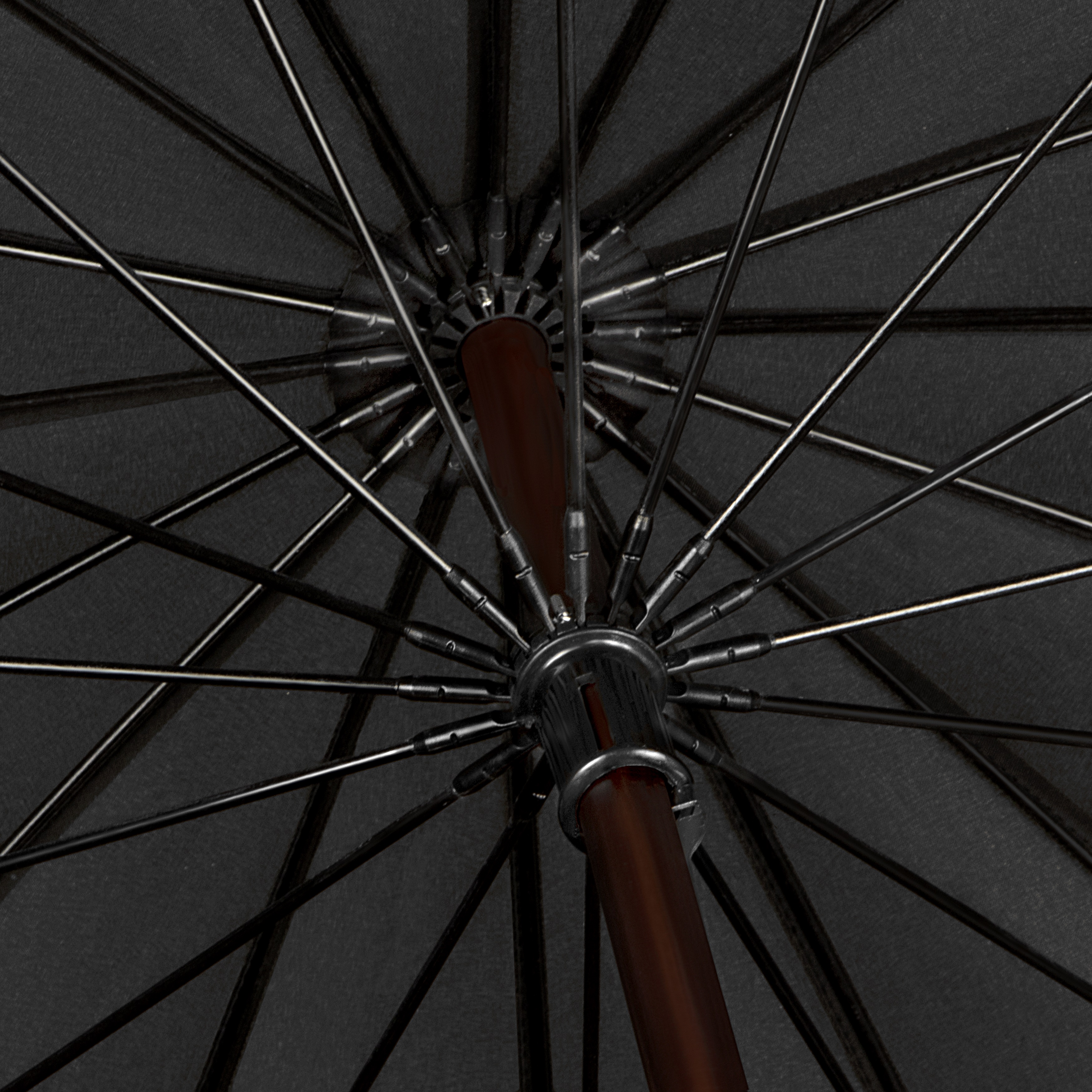 GR-440 Falcone® umbrella, 16 panels, black fiberglass ribs, wooden shaft and crook handle.