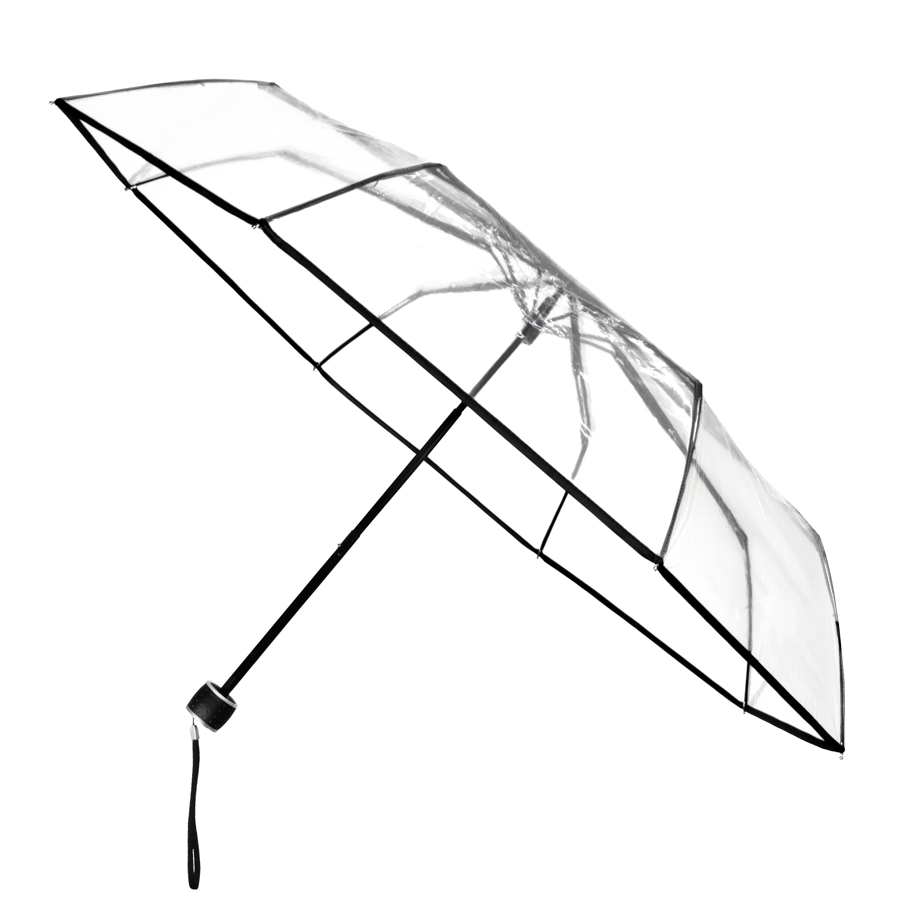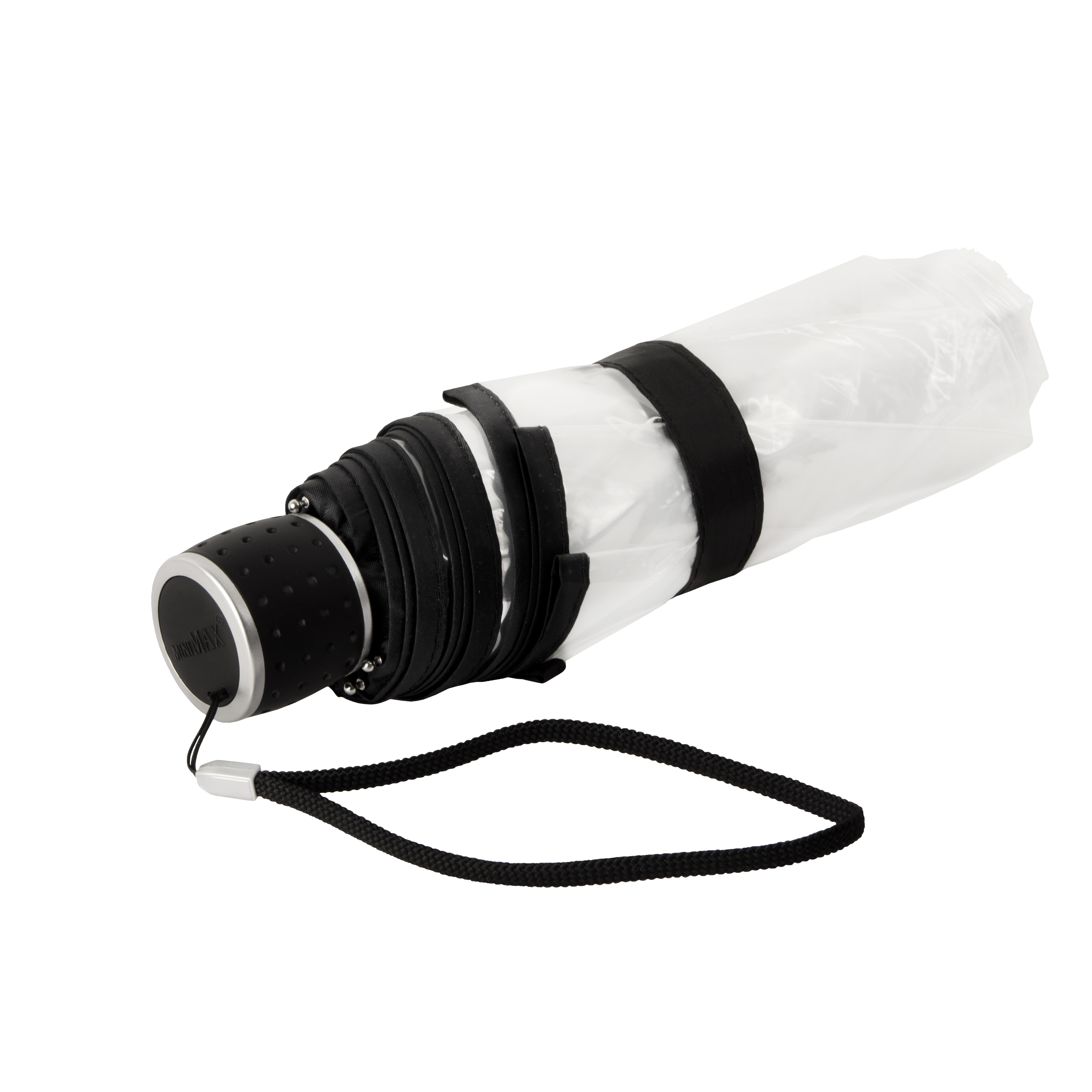 LF-191 miniMAX® transparent folding umbrella, windproof, 3-section, metal shaft, black fiberglass ribs, black plastic handle.