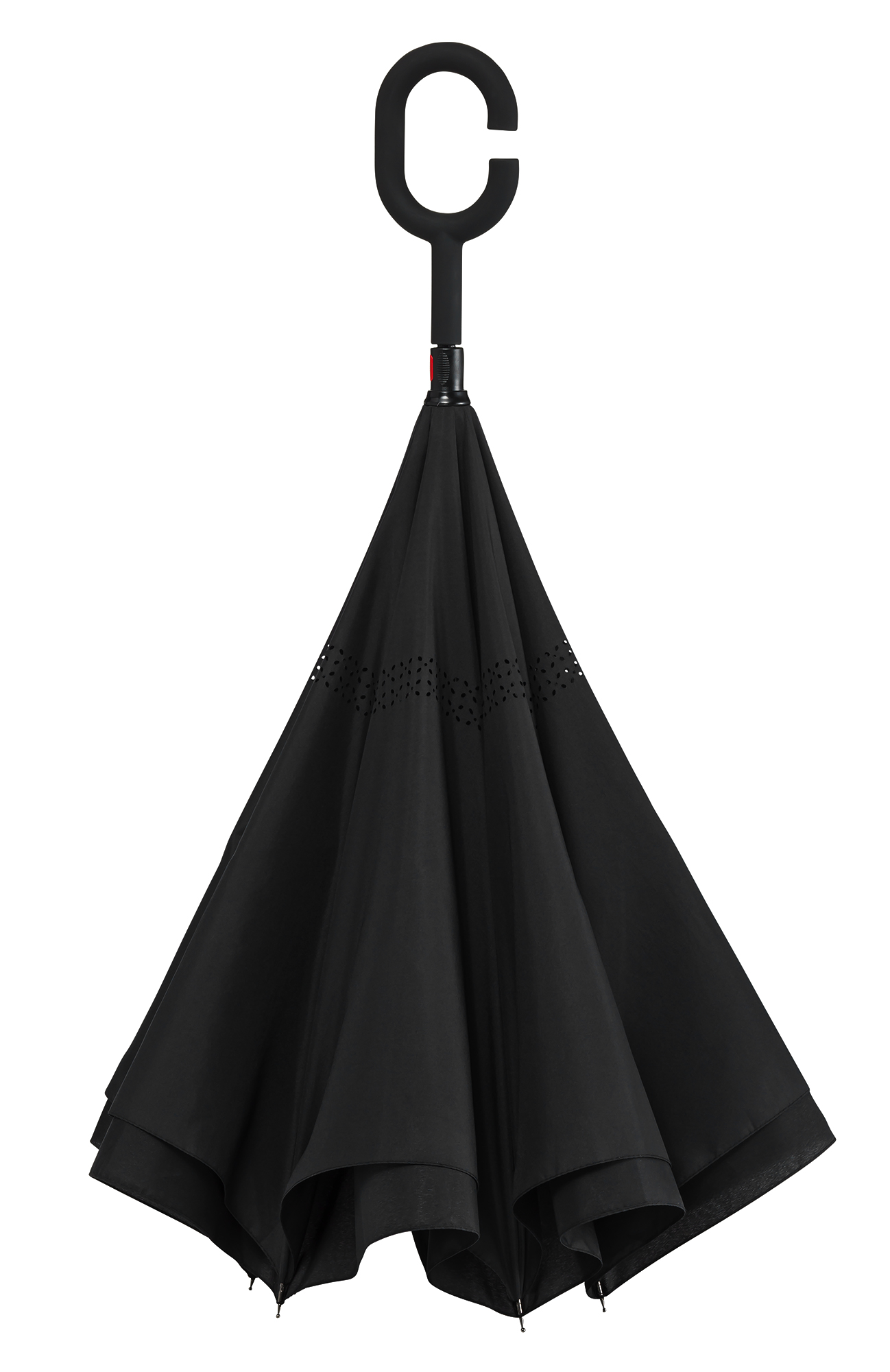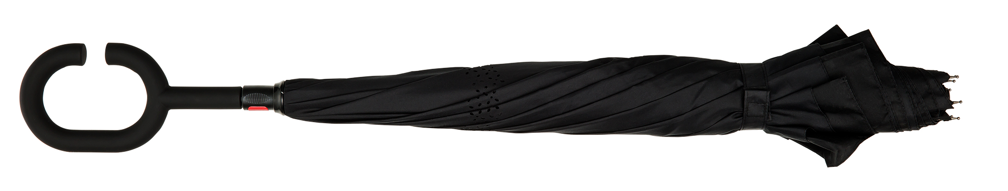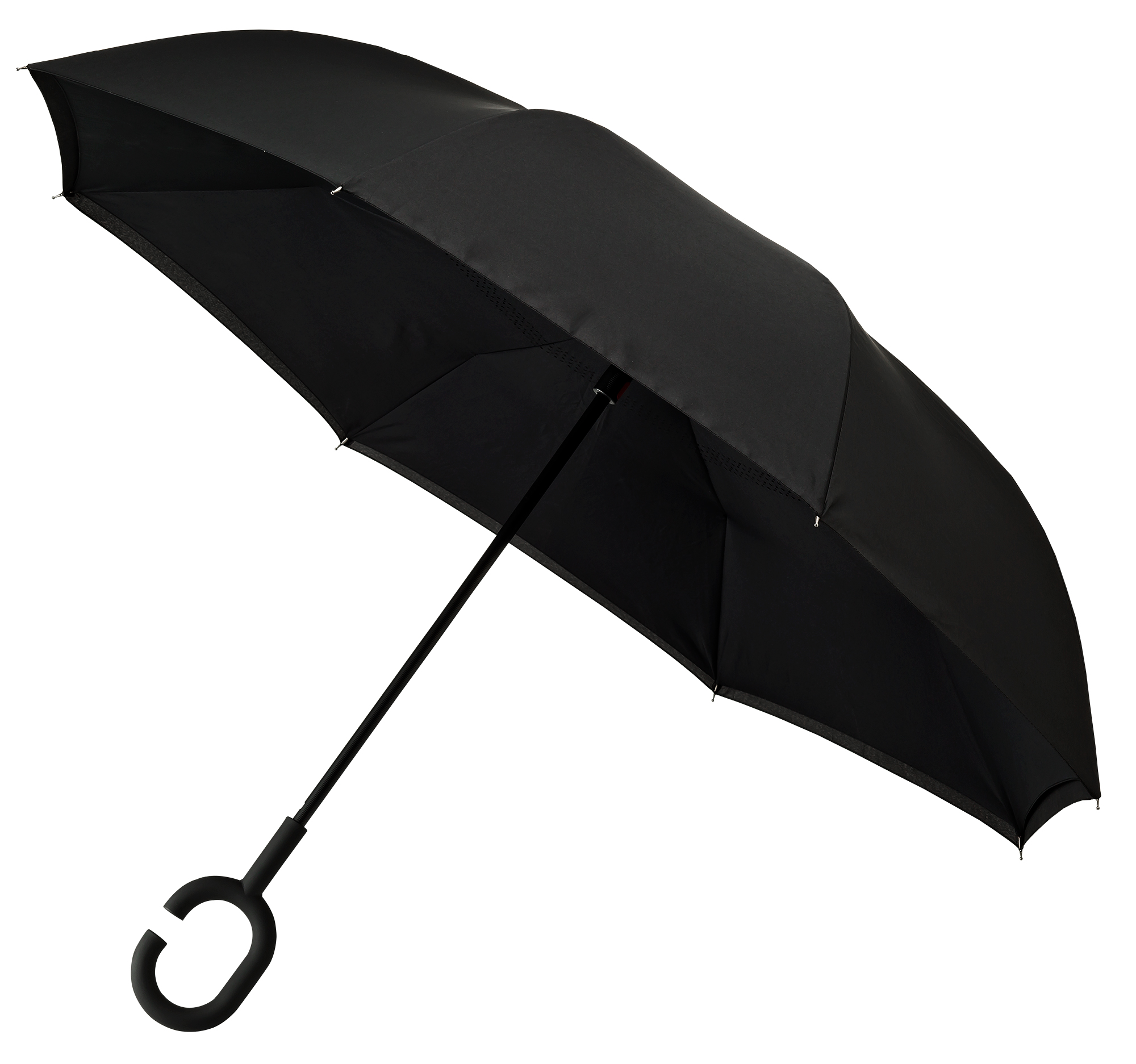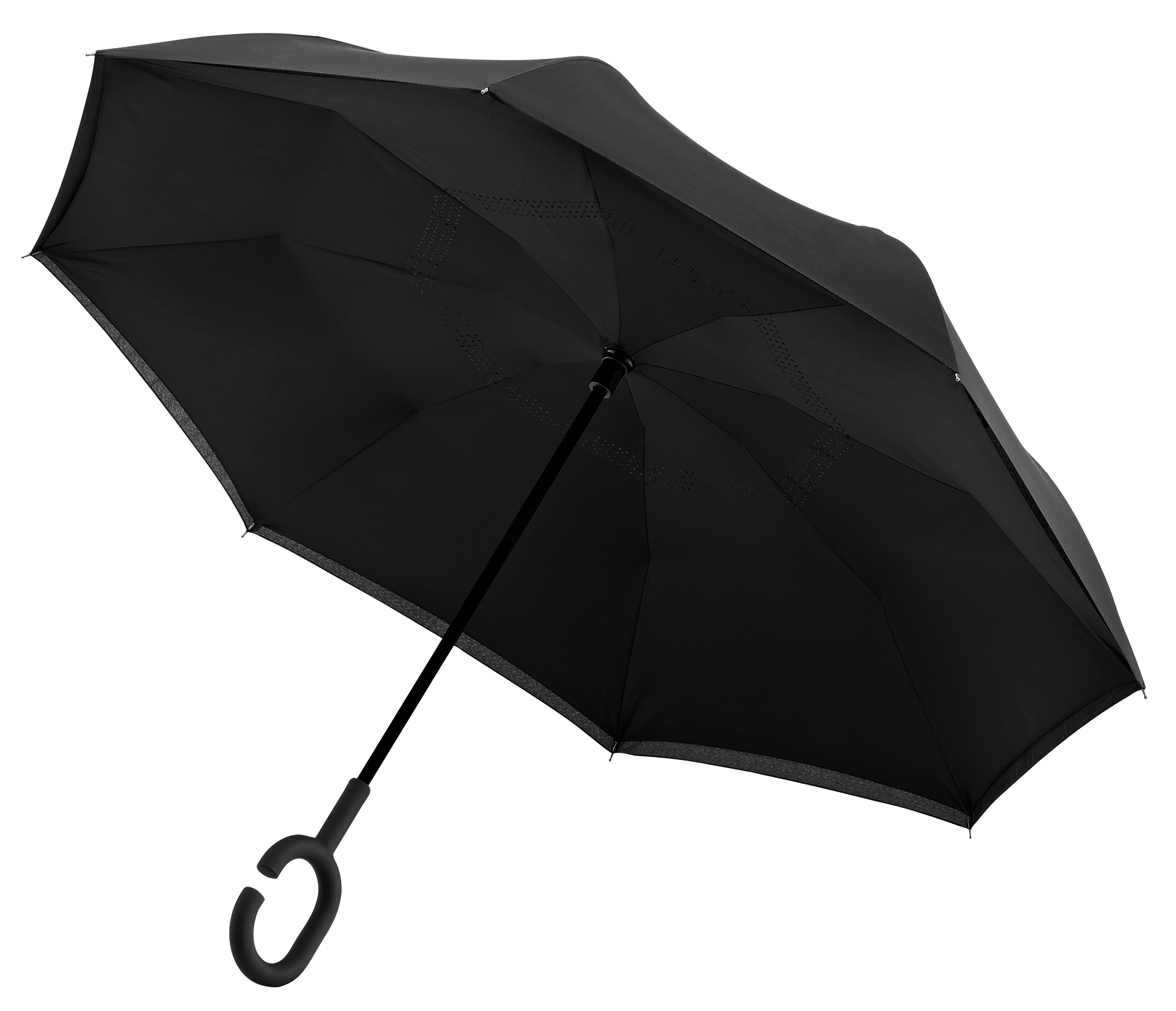 RU-6 Inside Out umbrella, double-layer, windproof, black shaft and fiberglass frame and easy opening system. The special design allows this umbrella to stand totally on its own, without any support, when closed and is equipped with a special C-shaped hand free grip.
