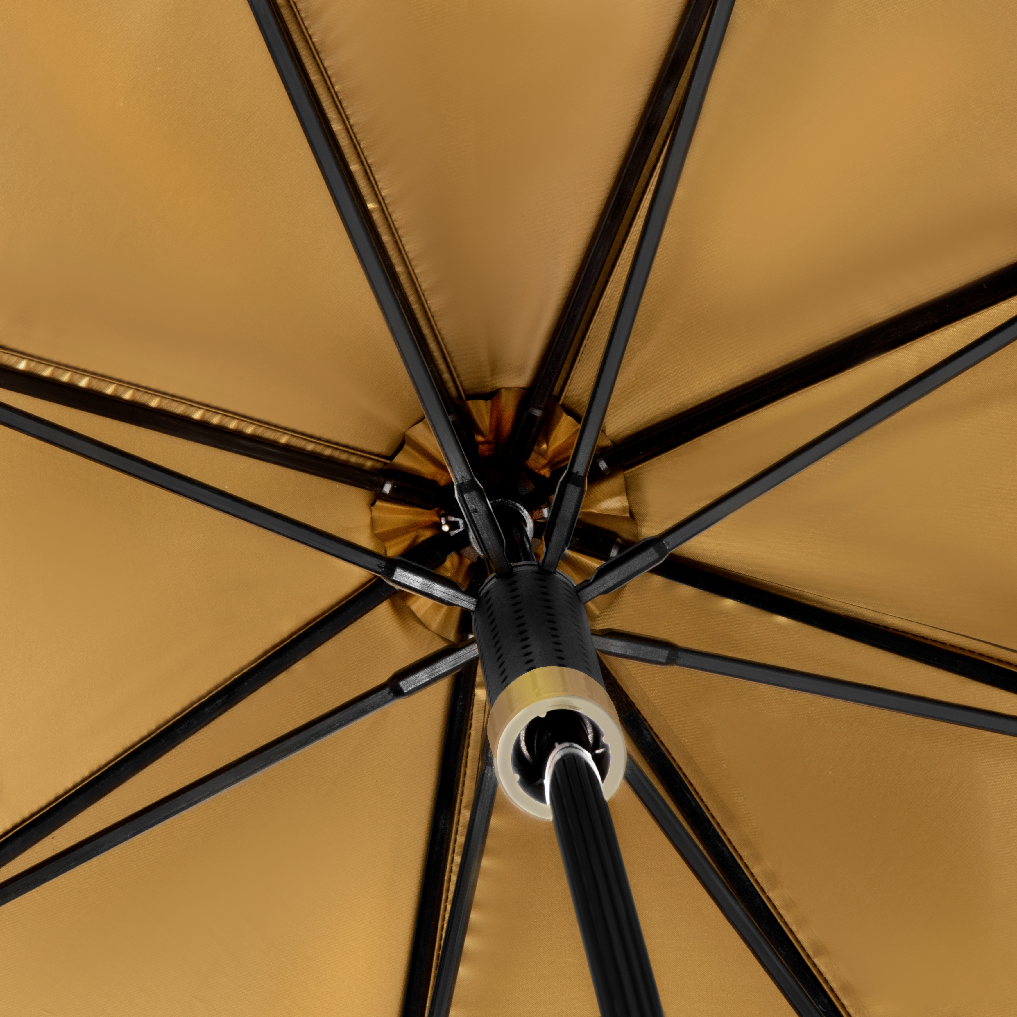 The STORMaxi® storm umbrella is both effective and sustainable. "It's just smart not to use more materials in a design than you actually need!" This is what the Dutch consumer affairs programme KASSA, aired by the VARA broadcasting association, said in praise of the STORMaxi's® efficient material usage. What's more: the umbrella doesn't break, even under extreme weather conditions! So STORMaxi® is both an effective and very sustainable storm umbrella! STORMaxi® aerodynamic storm umbrella. This umbrella has been wind tunnel tested and easily resists winds up to 100 kms/h. black shaft, fiberglass frame with reinforced joints, black handle with golden accents, with selfcase. The aerodynamic storm umbrella with the broad back for maximum protection against rain!!