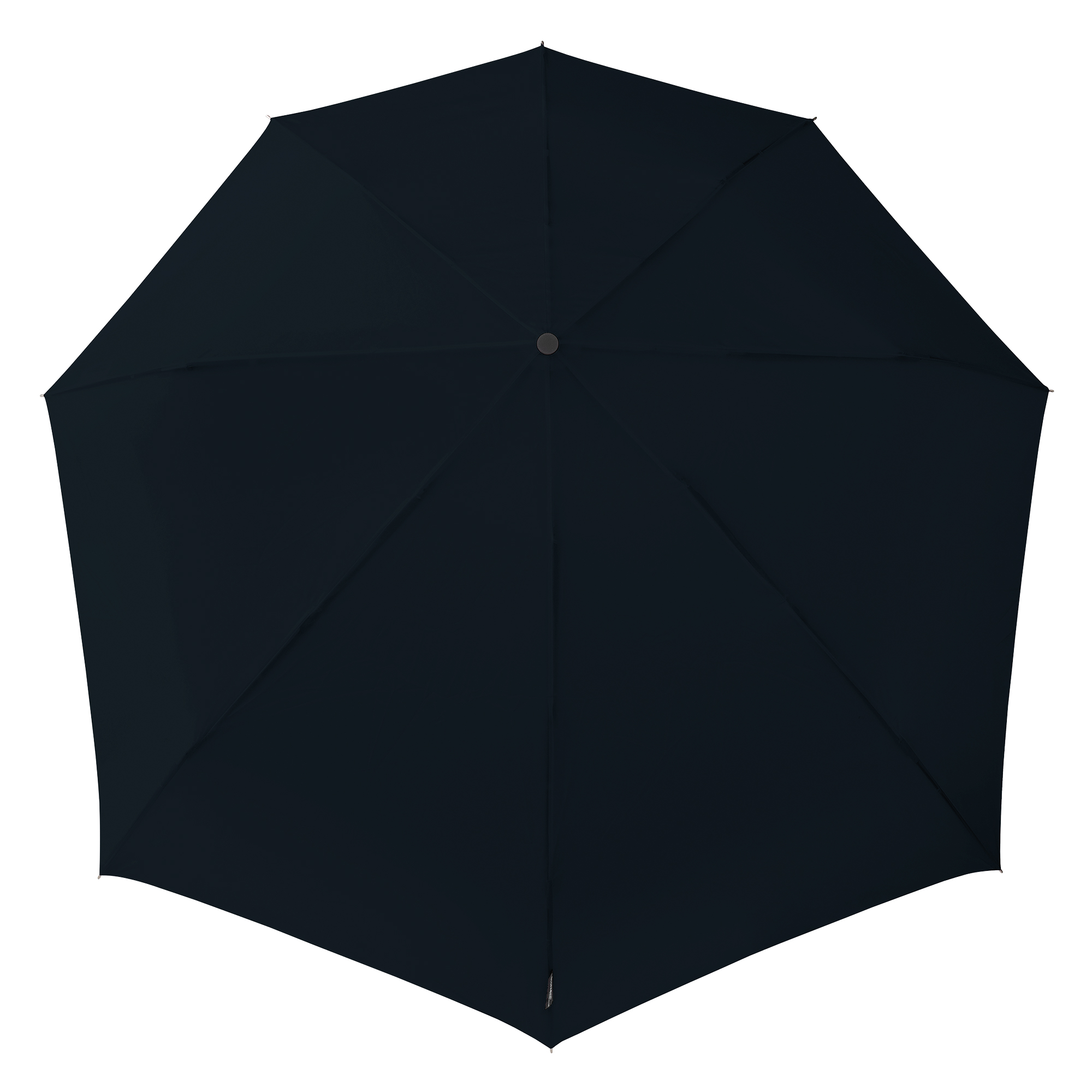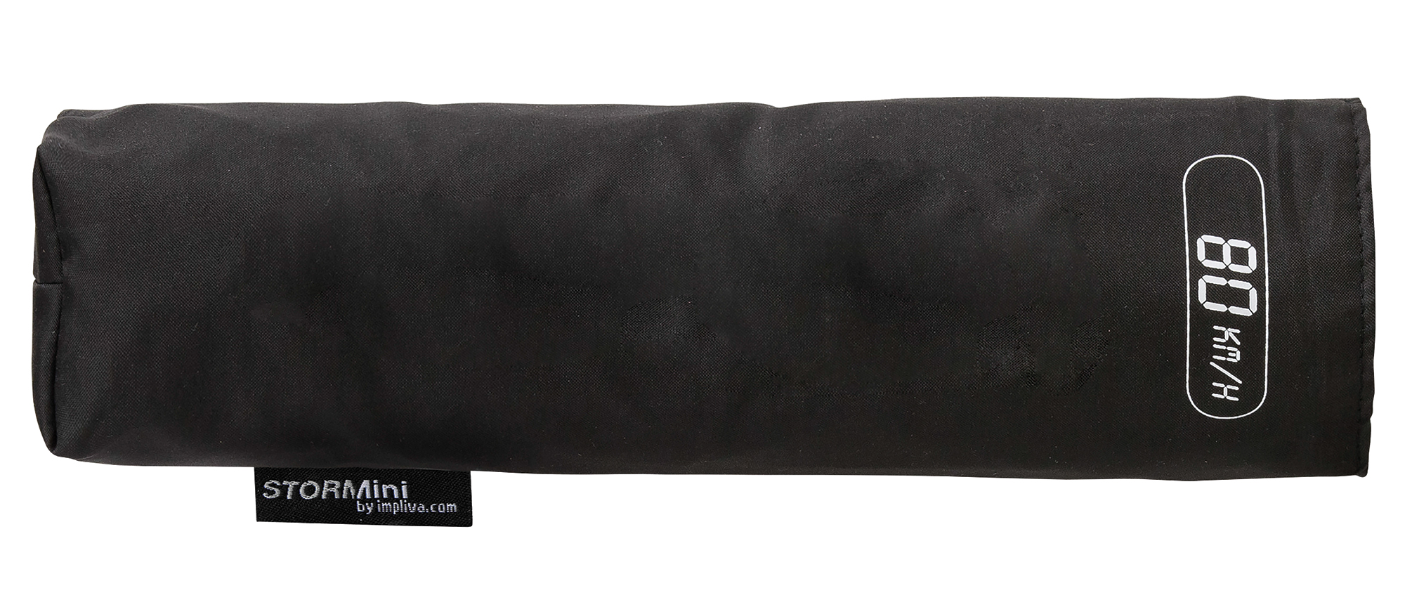 ST-9 STORMaxi® aerodynamic foldable storm umbrella. This improved version of our storm umbrella has been wind tunnel tested and easily resists winds up to 80 kms/h. It has a black reinforced 3-section shaft and a reinforced black aluminium/fiberglass frame. It also has a very comfortable matt black handle and comes in a sleeve. The broad back of the STORMini® offers maximum protection against rain!