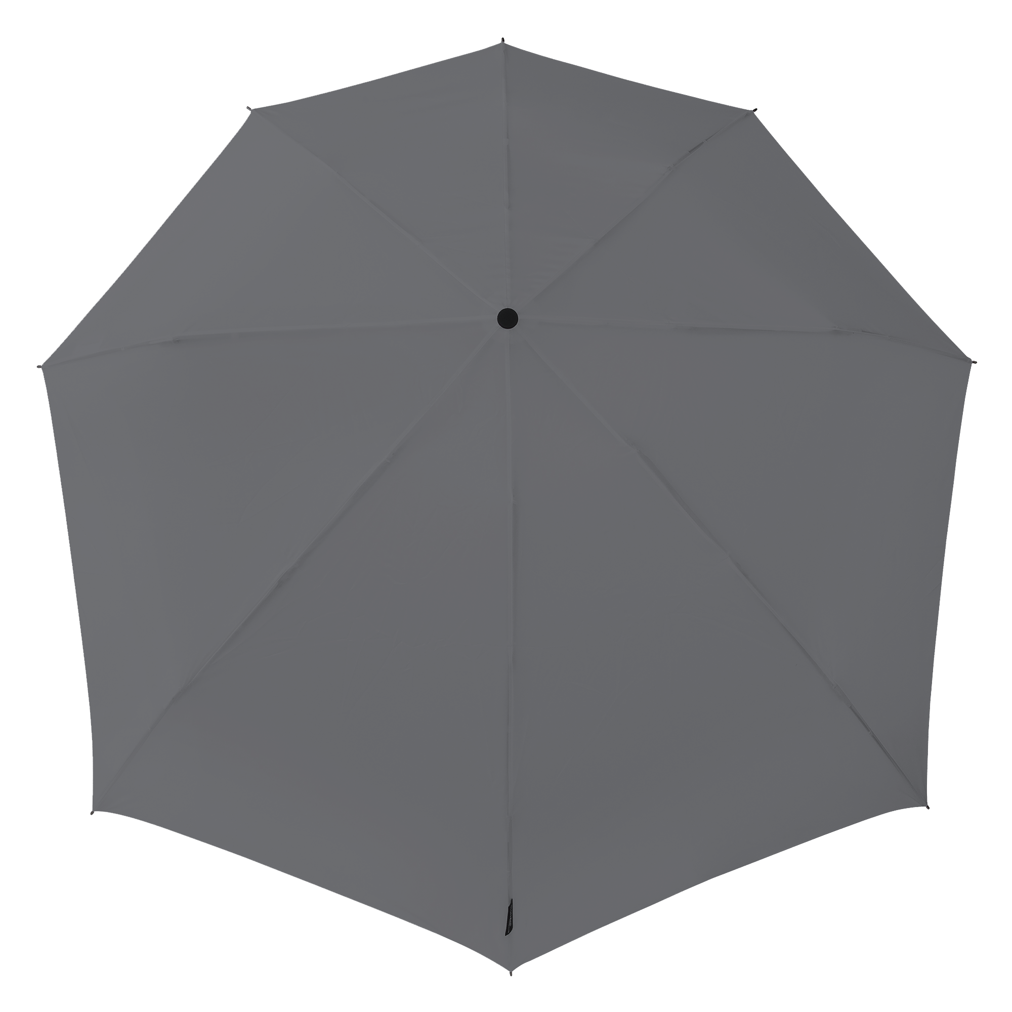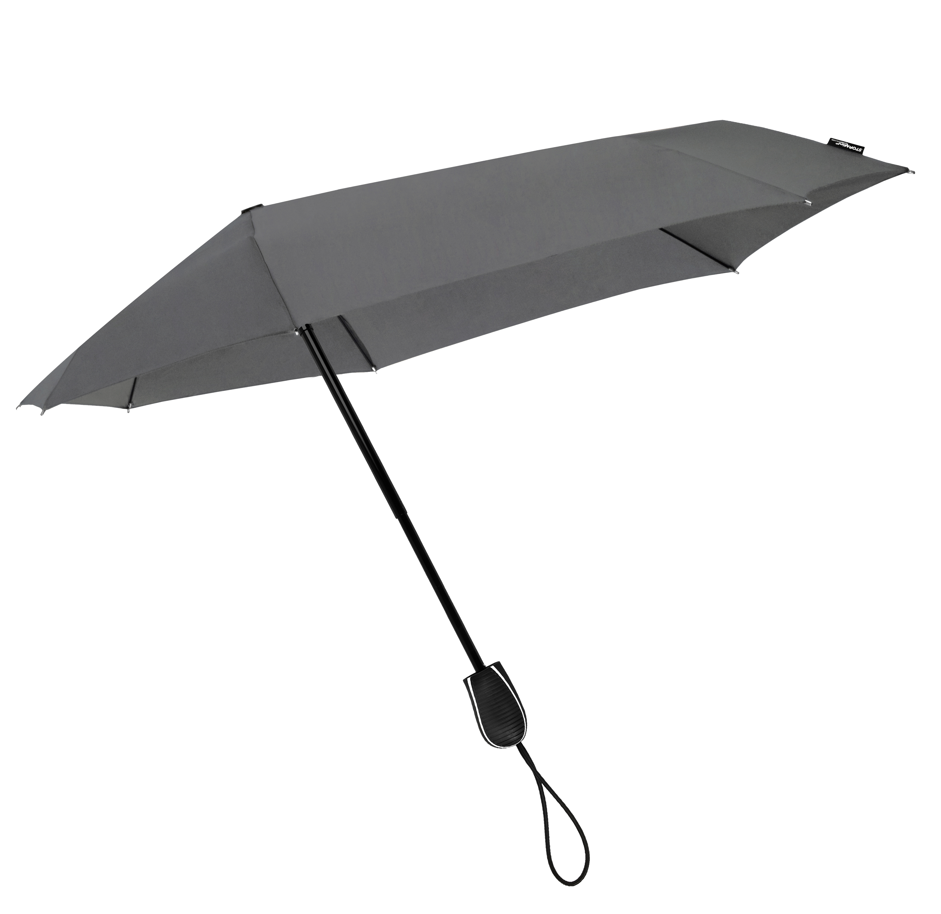 ST-9 STORMaxi® aerodynamic foldable storm umbrella. This improved version of our storm umbrella has been wind tunnel tested and easily resists winds up to 80 kms/h. It has a black reinforced 3-section shaft and a reinforced black aluminium/fiberglass frame. It also has a very comfortable matt black handle and comes in a sleeve. The broad back of the STORMini® offers maximum protection against rain!